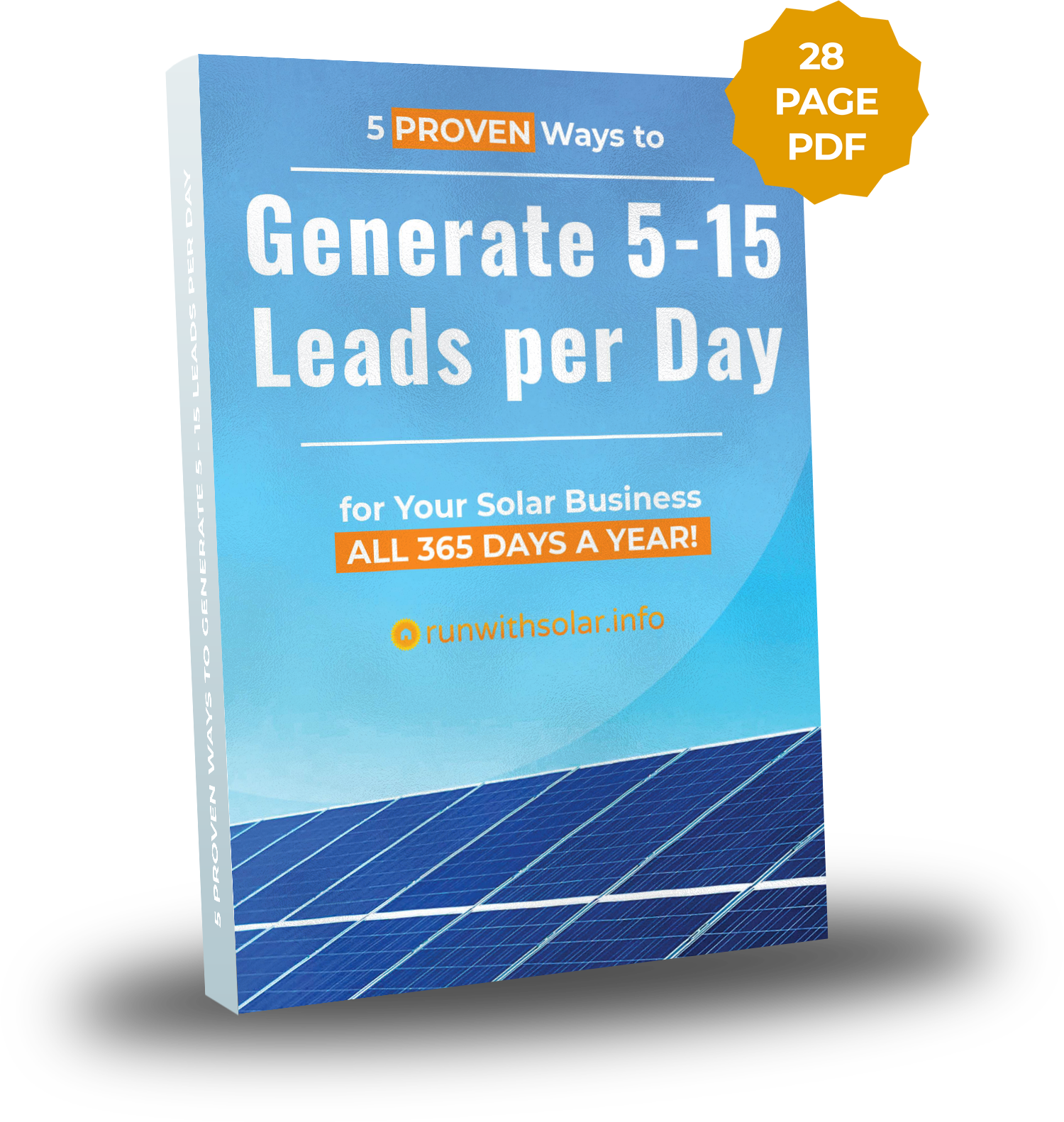 " Generating leads for solar has always been difficult and frustrating (especially when you purchase leads that you soon find out are terrible quality, sold to 3+ people, etc.). I knew I needed to find a way to generate my own leads and this PDF shows you 5 ways to do it, easily! I especially like the Solar Giveaway method! It's worked wonders for my business and I generate between 20-25 leads a day from this one method alone."